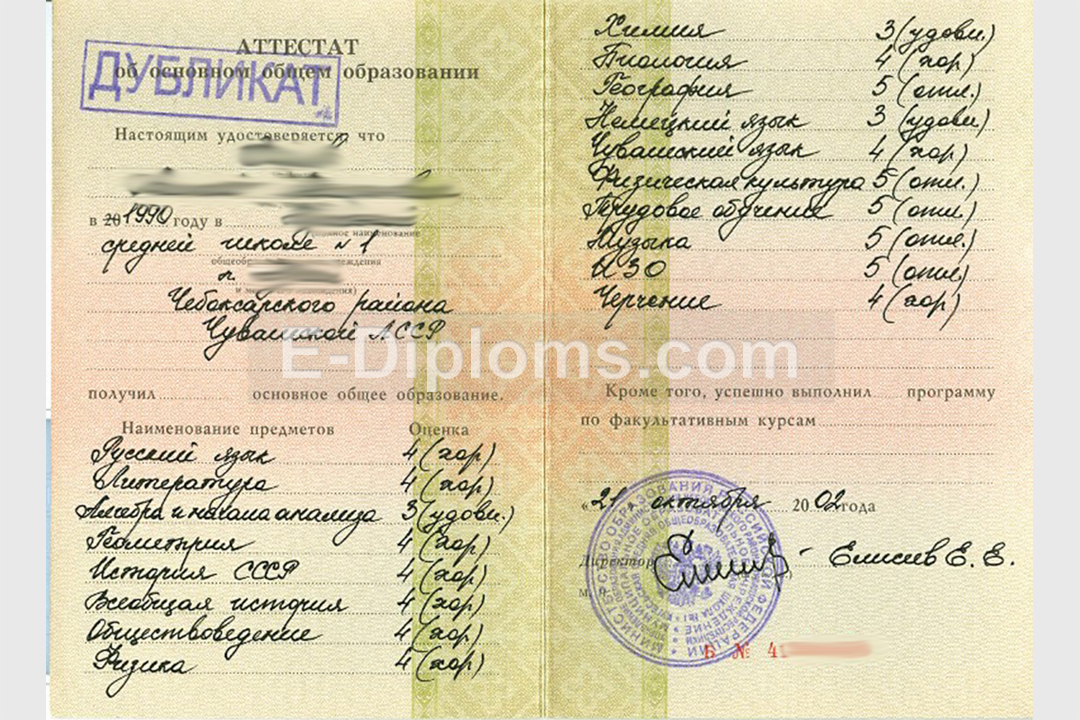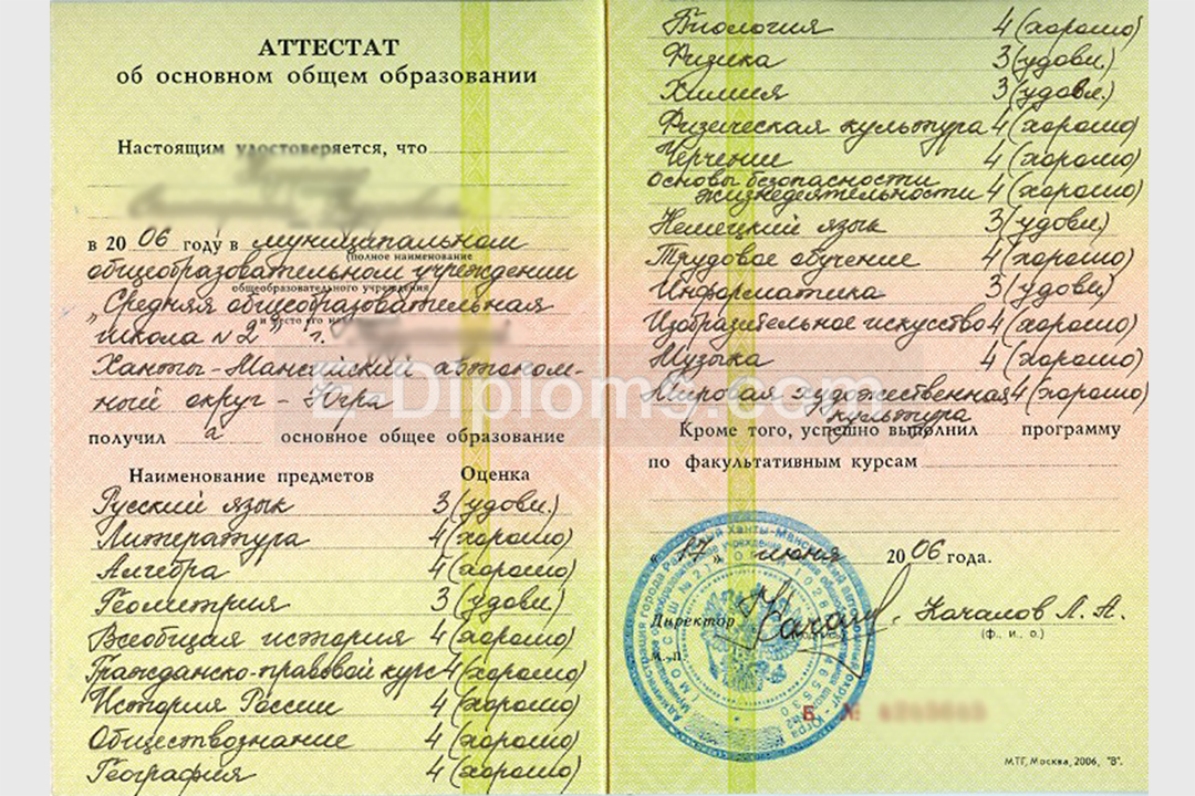 У нас на сайте Вы можете заказать аттестат об окончании 9 классов с 1994 по 2006 года включительно. Выбирайте любую школу России, а мы изготовим качественный документ быстро, профессионально, анонимно и в соответствии со всеми стандартами, принятыми в тот период. Доставка бесплатна, оплата при получении, для проживающих в регионах доступна услуга «макет», есть скидки. При заказе до 14.00 привезем уже завтра!