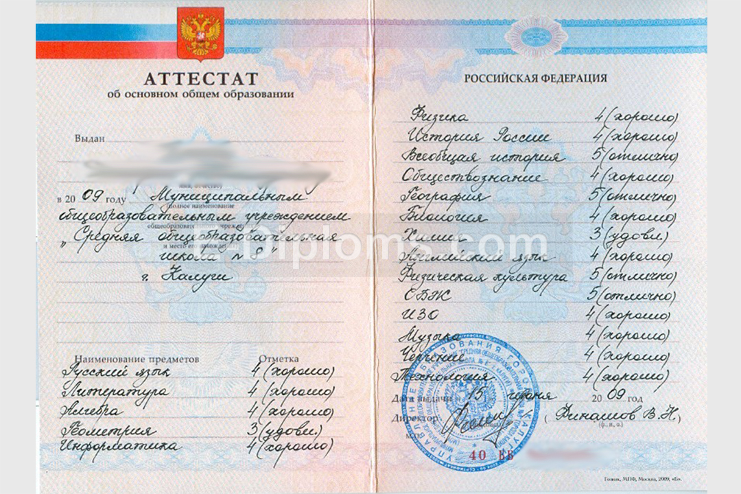 У нас на сайте Вы можете заказать аттестат об окончании 9 классов с 2007 по 2009 года включительно. Выбирайте любую школу России, а мы изготовим качественный документ быстро, профессионально, анонимно и в соответствии со всеми стандартами, принятыми в тот период. Доставка бесплатна, оплата при получении, для проживающих в регионах доступна услуга «макет», есть скидки. При заказе до 14.00 привезем уже завтра!
