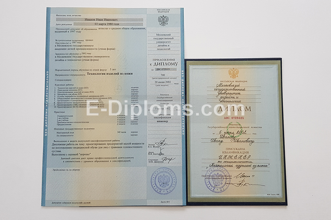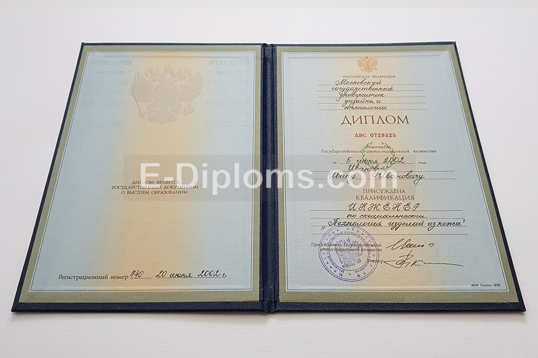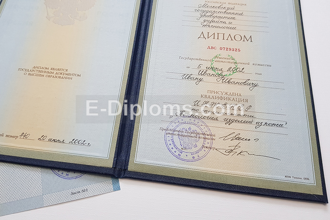 На нашем сайте Вы можете купить настоящий диплом об окончании ВУЗа с 1997 по 2003 года включительно. Вам доступны все вузы России и любые специальности, существовавшие в тот период. Обращайтесь, мы изготовим качественный документ, к подлинности которого не возникнет ни единого вопроса. Доставим быстро и бесплатно, оплата курьеру при получении, для проживающих в регионах доступна услуга «макет», есть скидки. При заказе до 14.00 привезем уже завтра!